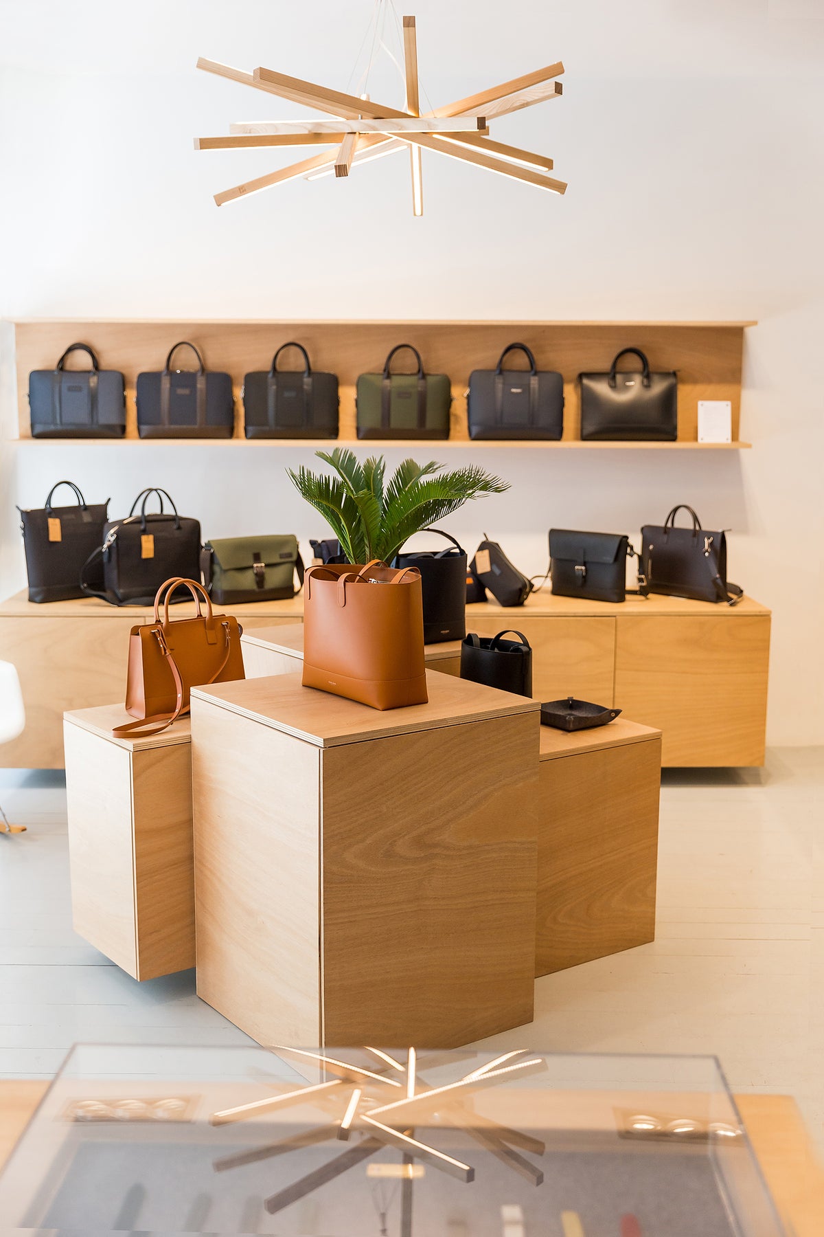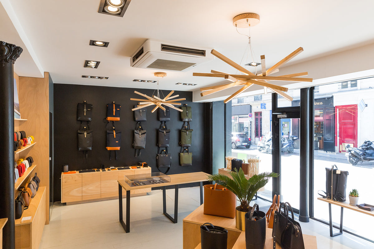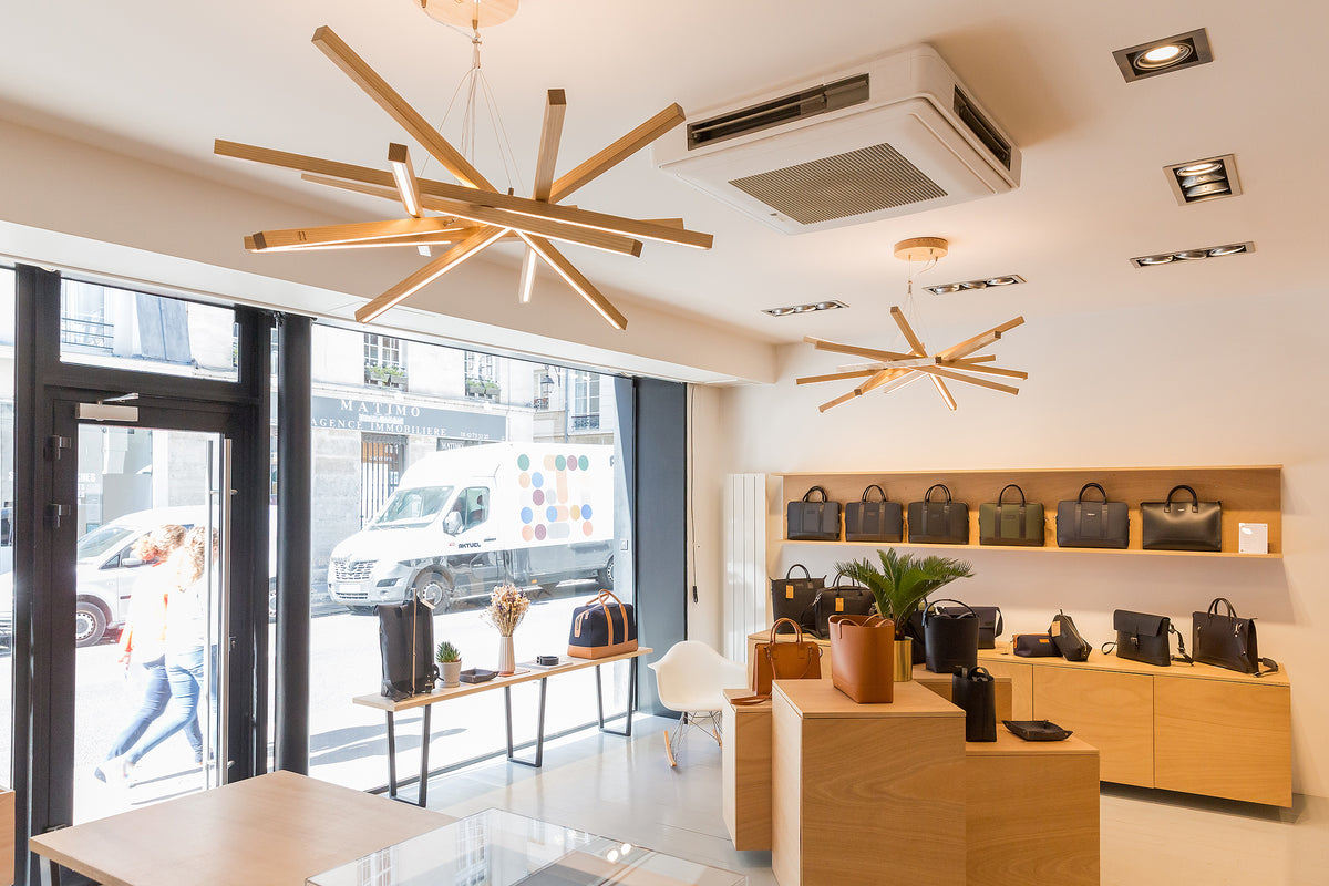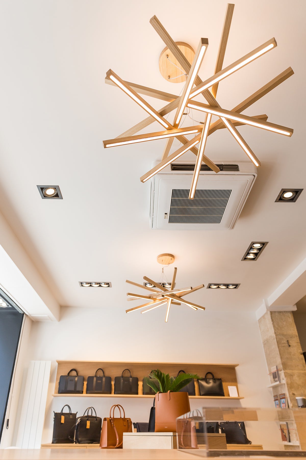 Durch die Kombination von maximaler Funktionalität, klaren, von Hand polierten Linien und reinem Karpatenholz setzen die Vortex-Kronleuchter einen Akzent im lakonischen Interieur der Ateliers Auguste-Boutique und harmonieren mit der Kollektion der Marke.