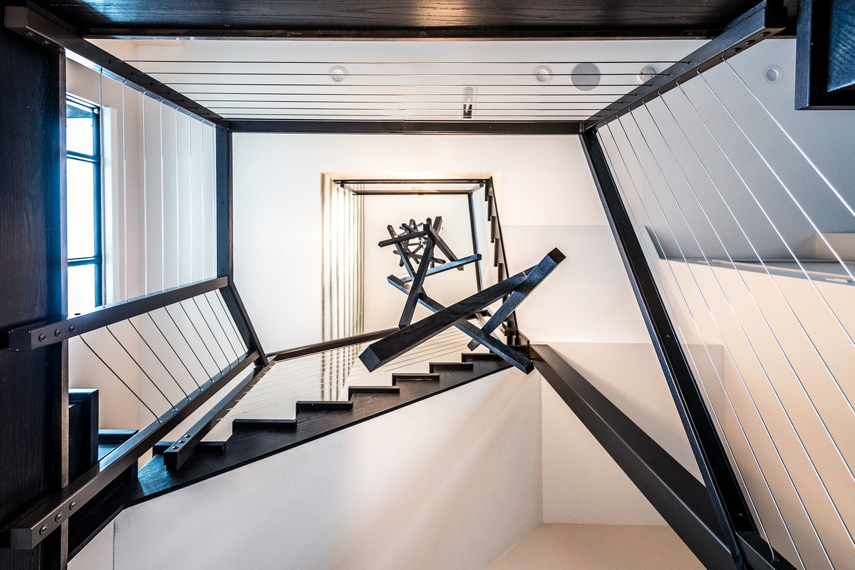 Die Besonderheit des DNA-Kronleuchters besteht darin, dass jeder vierte Stab seine Platzierung im Raum wiederholt und eine Spirale bildet, die an DNA erinnert.