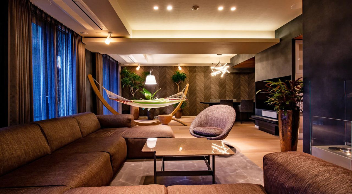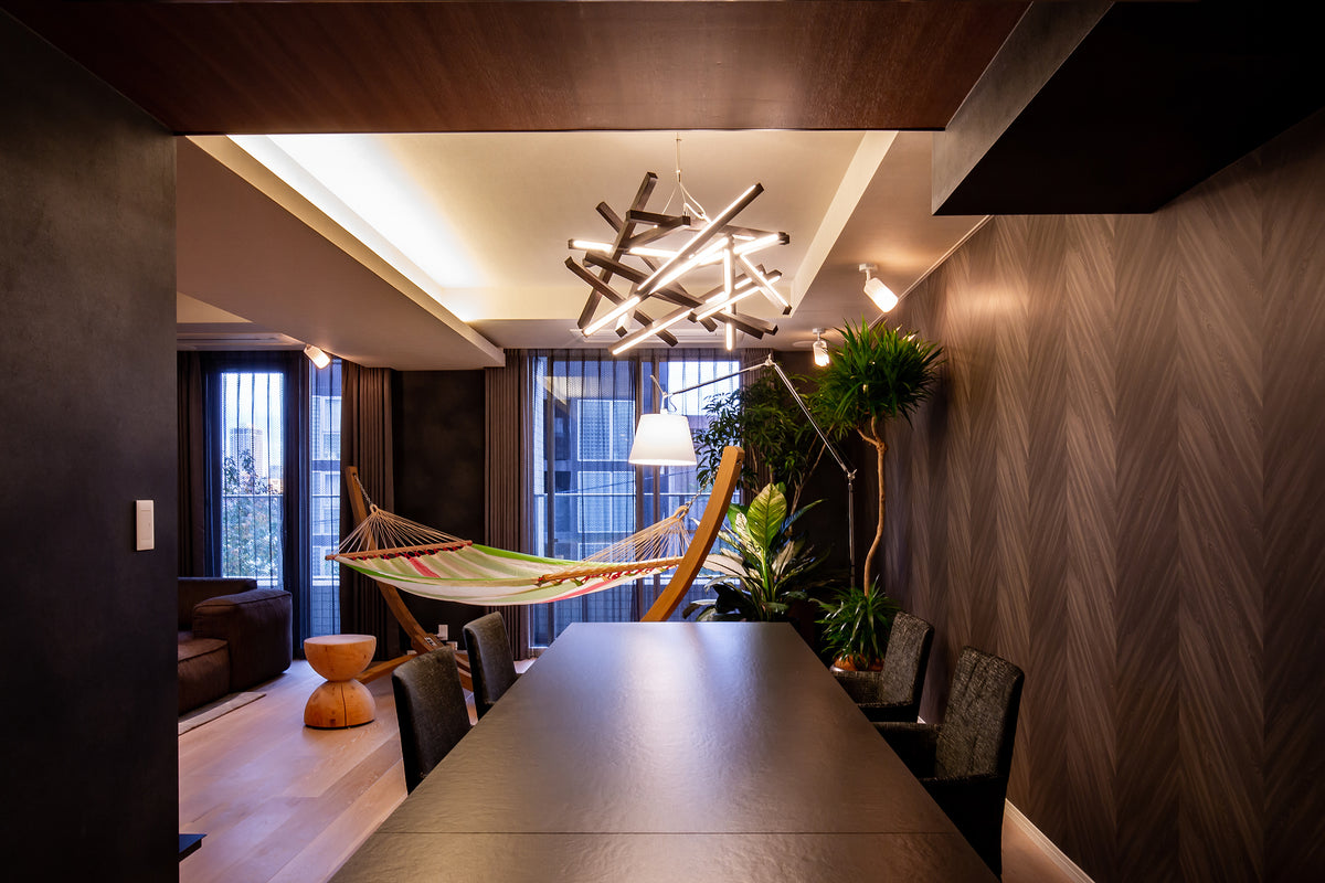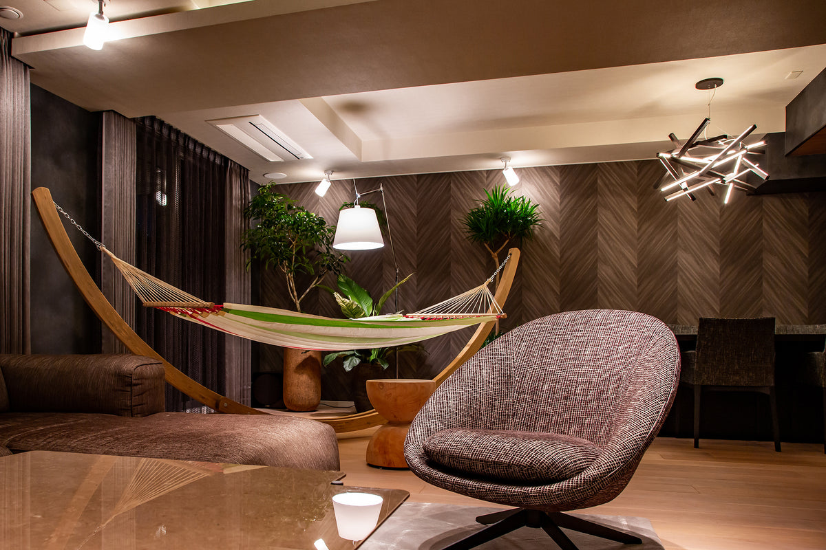 Holzmöbel und dunkle Farben sind heutzutage in der Innenarchitektur sehr beliebt. Dies ist auch der Stil dieser Wohnung. Das Wohnzimmer verfügt über eine große Hängematte und einen Kamin, um ein friedliches Interieur zu schaffen.